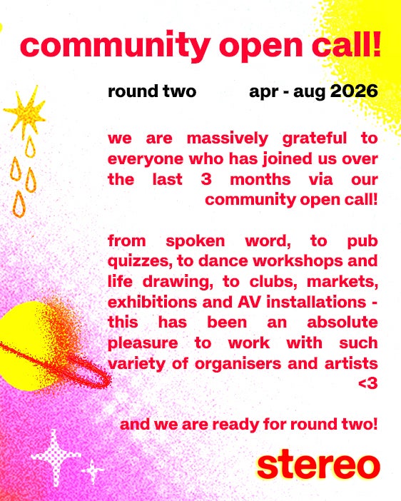 awrite folk, MIX’NMOVE is aw aboot gettin’ dancers & the nightlife reacquainted! the club’s where it aw started, init? we’re here tae reignite that spark, the history & the folk. on the 26th April we’re takin’ over Stereo 4–10PM for a full Sunday
